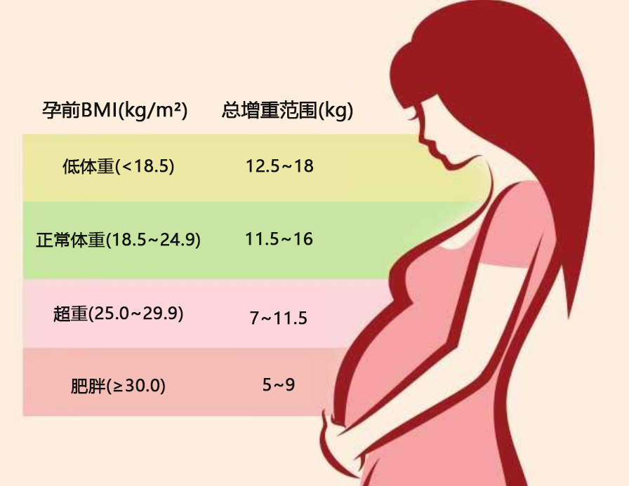 比如,一位女性在怀孕之前身高1.6m,体重50kg,那么她的BMI就是50/1.6²=19.53,属于标准体重的范围。