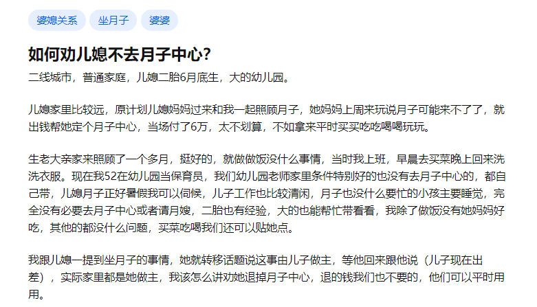 帖子中,这位婆婆在请教如何劝儿媳不去月子中心?
