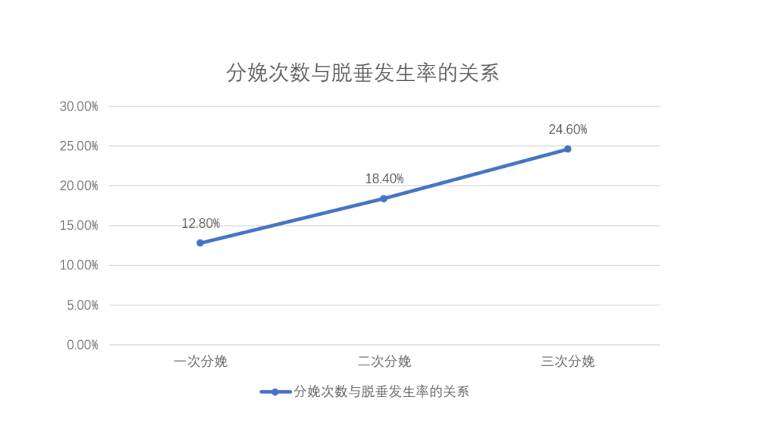 研究表明,盆腔器官脱垂与产次呈正相关,一胎发病率12.8%,二胎发病率18.4%, 三胎发病率24.6%。也就是二胎后,每5个女性有一个可能会发生脱垂,这在临床也得到了证实。
