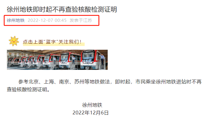 徐州地铁零点45分发布最新通知:参考北京、上海、南京、苏州等地铁做法,即时起,市民乘坐徐州地铁进站时不再查验核酸检测证明。