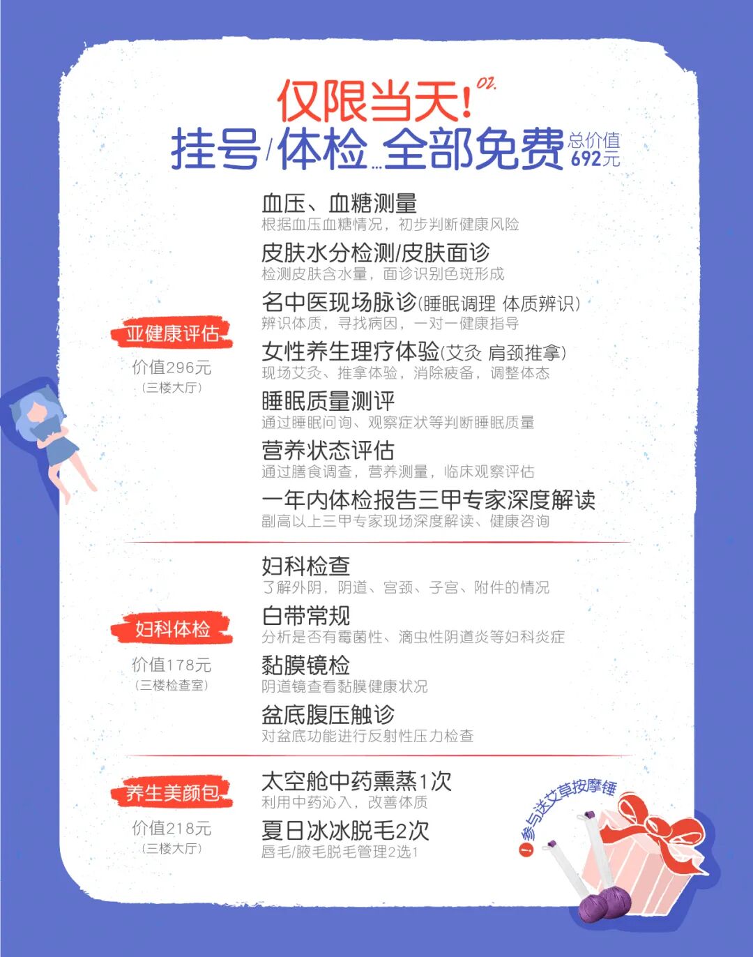 特邀中医科、妇科、甲乳科、营养科,盆底健康、围绝经期门诊等多学科专家联合义诊!现场免挂号费,免费体检,免费专家咨询。还可以带来1年内的体检报告,专家会现场帮您进行深度解读。